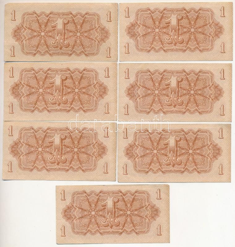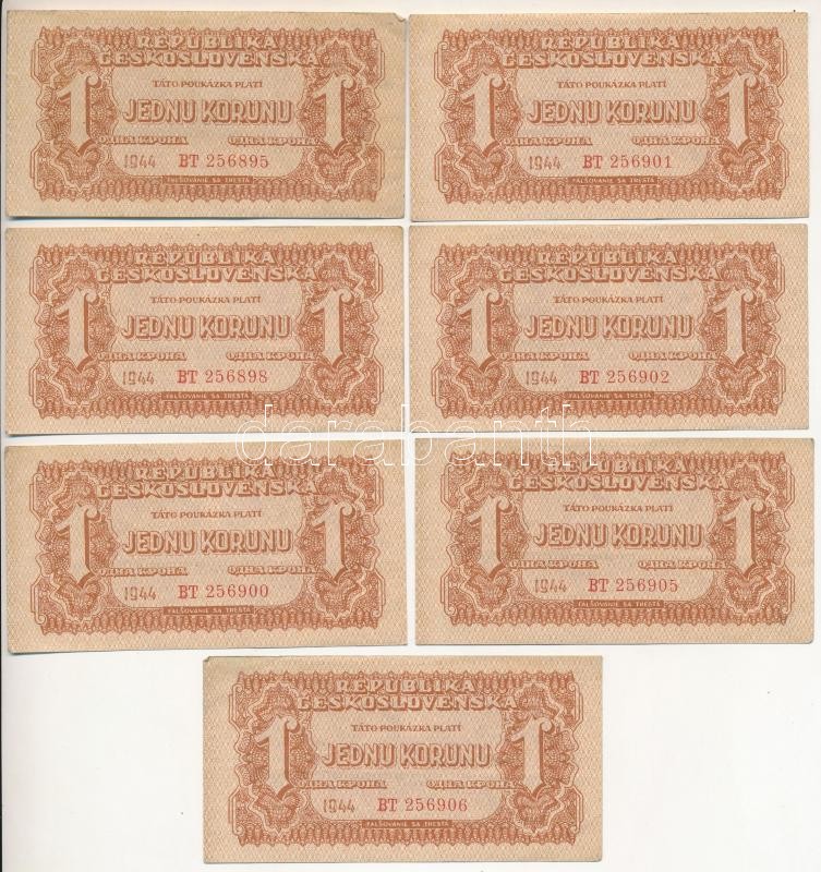 Csehszlovákia 1944. 1K (7x), sorszámkövetők és közeli sorszámúak T:II-,III Czechoslovakia 1944. 1 Korun (3x) sequential serial pair and sequential serial with one leap C:VF,F Krause P# 45