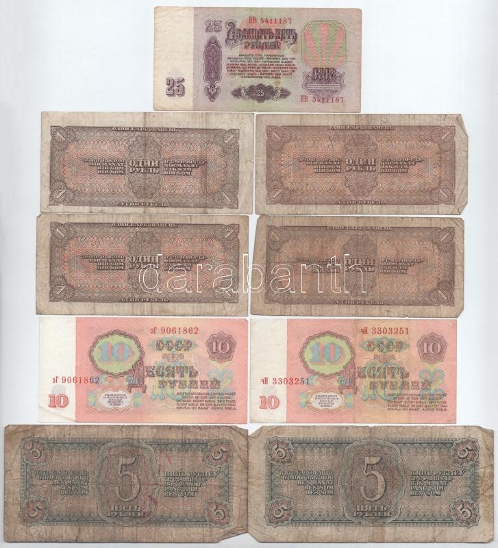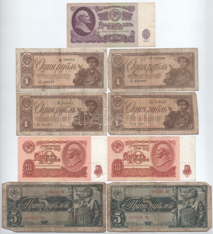 Szovjetunió 1938. 1R (4x) + 1938. 5R (2x) + 1961. 10R (2x) + 1961. 25R... https://www.darabanth.com/hu/400-Gyorsarveres/400.0/Numizmatika/Kulfoldi-bankjegyek~2000013/Szovjetunio-1938-1R-4x-plus-1938-5R-2x-plus-1961-10R-2x-plus-1961-25R-TIII-III--Soviet-Union-193~II2453811