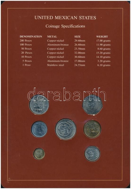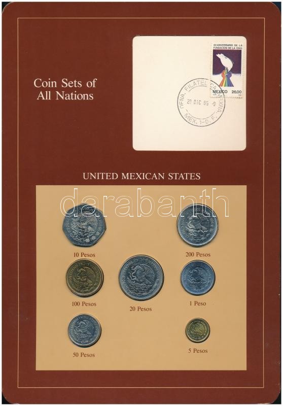 Mexico 1984-1985. 1 Peso - 200 Pesos (7xdiff) "Coin Sets of All Nations" coin set on cardboard with stamp C:UNC,AU
