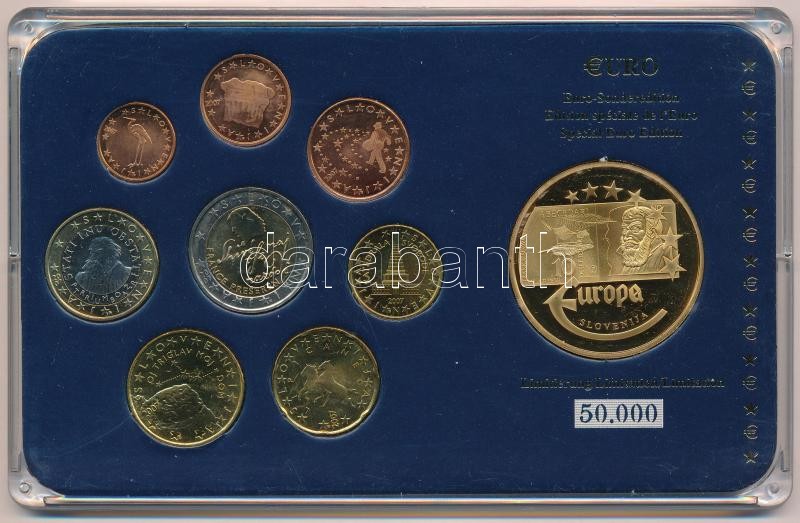 Slovenia 2007. 1 Cent - 2 Euro (8xdiff) coin set + 2003. "Europa" two-sided, gilt medallion in plastic case C:UNC-XF