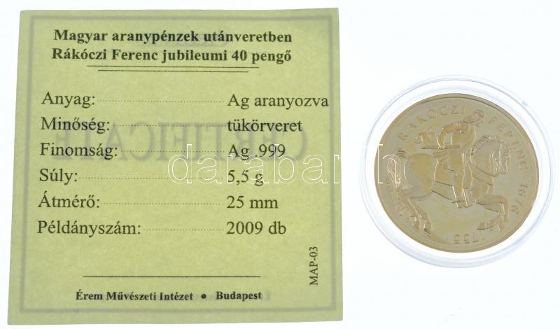 Leírás: DN "Magyar aranypénzek utánveretben - Rákóczi Ferenc jubileumi 40 Pengő" aranyozott Ag emlékérem tanúsítvánnyal (5,5g/0.999/25mm) T:PP