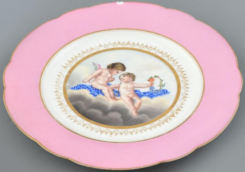 Hüttl Tivadar antik, puttós jelenettel díszített porcelán tányér, XIX. sz. közepe. Kézzel festett/rózsaszín fond díszítéssel, Hüttl Pest jelzéssel, kisebb kopásnyomokkal, szélén kis lepattanásokkal, d: 20,5 cm