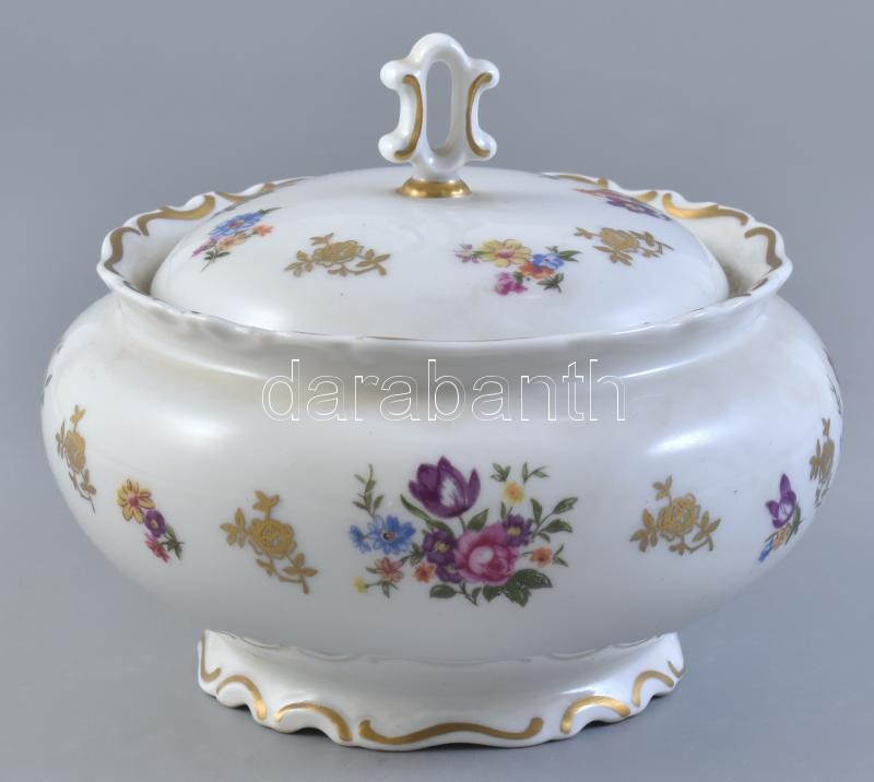 Leírás: Reichenbach virágmintás porcelán bonbonier. Részben kézzel festett, jelzett, minimális kopással, m: 12,5 cm, d: 14 cm