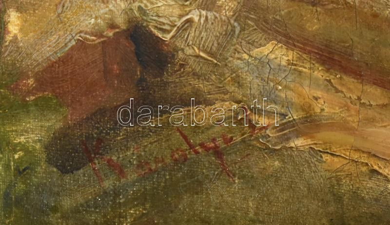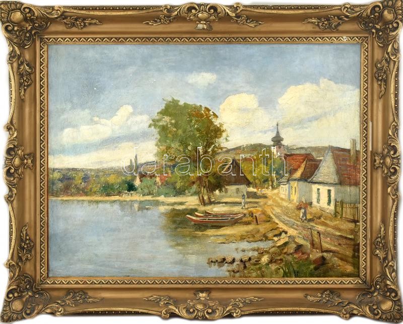 Leírás: Károlyi L jelzéssel (?Károlyi Lajos, 1877-1927?): Vízparti házak (Tiszapart?). Olaj, vászon, javított. Dekoratív, kissé sérült régi keretben. 60x79 cm