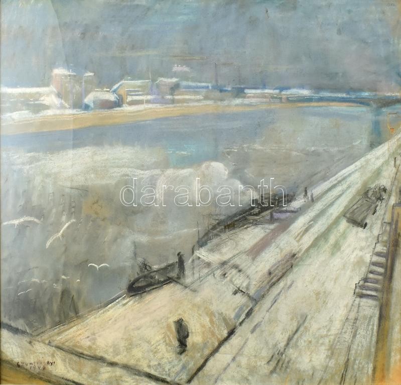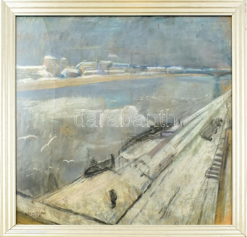 Leírás: Szentiványi Lajos (1909-1973): Dunapart, 1942. Pasztell, papír, jelzett. Sérült. Üvegezett fa keretben, 66,5×70,5 cm