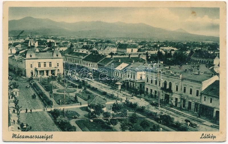 Máramarossziget, Sighetu Marmatiei; látkép. leporellólap, belül: Horthy Miklós tér, Korona szálloda, Városi színház, stb. / general view. leporellocard with squares, hotel, theatre, etc. (EK)