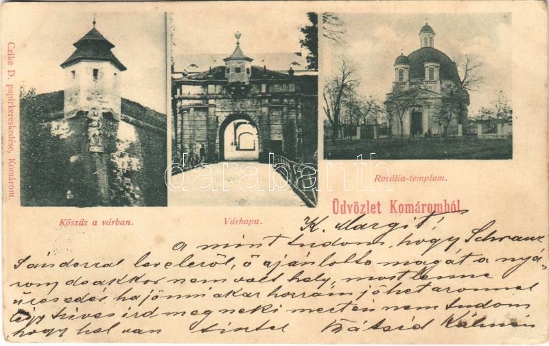 Leírás: 1899 Komárom, Komárno; Kőszűz a várban, várkapu, Rosália templom. Czike D. kiadása / castle, castle gate, church (EK)
