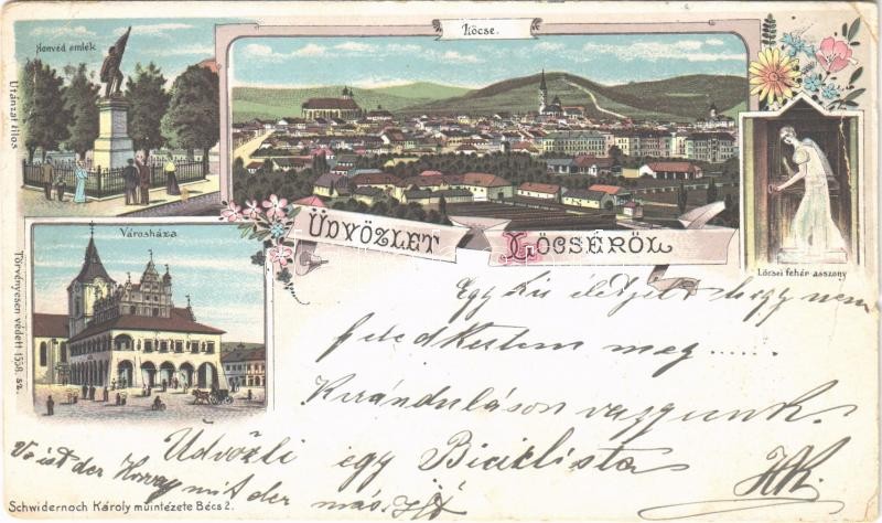 1899 Lőcse, Levoca; Honvéd emlékmű, látkép, városháza, Lőcsei fehér asszony. Schwidernoch Károly műintézete / military monument, general view, town hall. Art Nouveau, floral, litho (vágott / cut)