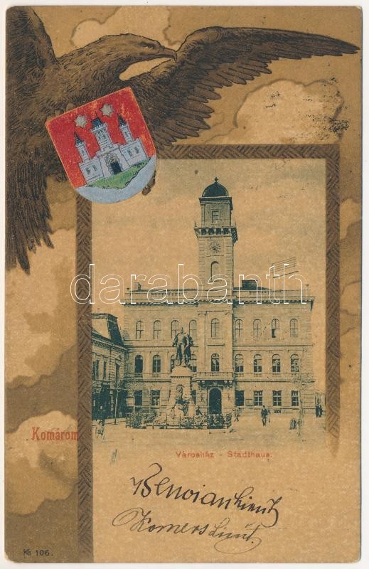 1901 Komárom, Komárno; Városháza. Szecessziós címeres litho keret sass... https://www.darabanth.com/hu/401-Gyorsarveres/401.0/Kepeslapok/Felvidek~1500013/1901-Komarom-Komarno-Varoshaza-Szecesszios-cimeres-litho-keret-sassal-Freisinger-Mor-kiad~II2463995