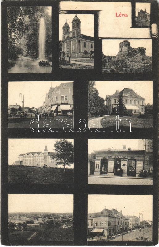 Leírás: 1913 Léva, Levice; zsinagóga, utca, vár, Dukesz Lipót üzlete és saját kiadása / synagogue, shops, streets, castle (EK)