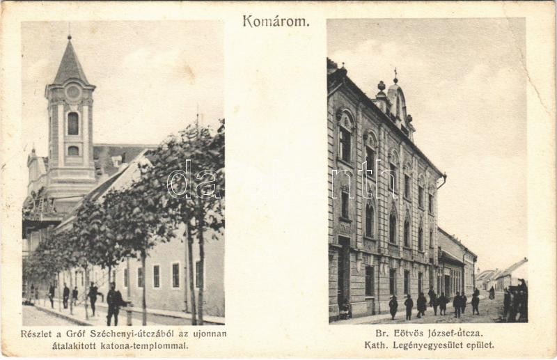 1927 Komárom, Komárno; Gróf Széchenyi utca az újonnan átalakított katona templommal, Báró Eötvös József utca, Katolikus Legényegyesület épülete. Sipos F. kiadása / street view, church, Catholic Boys' Association's building (EB)