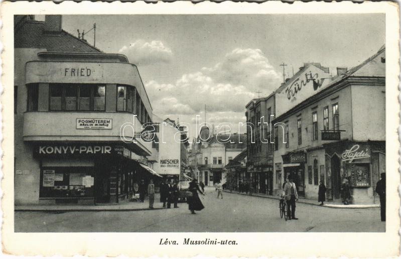 1940 Léva, Levice; Mussolini utca, Fried, Hatscher, Kürti, Hajdú, Deutsch üzlete, Bázlik Mihály fogműterme, patika, gyógyszertár, kerékpár. Hajdú foto / street view, shops, pharmacy, bicycle (EK)