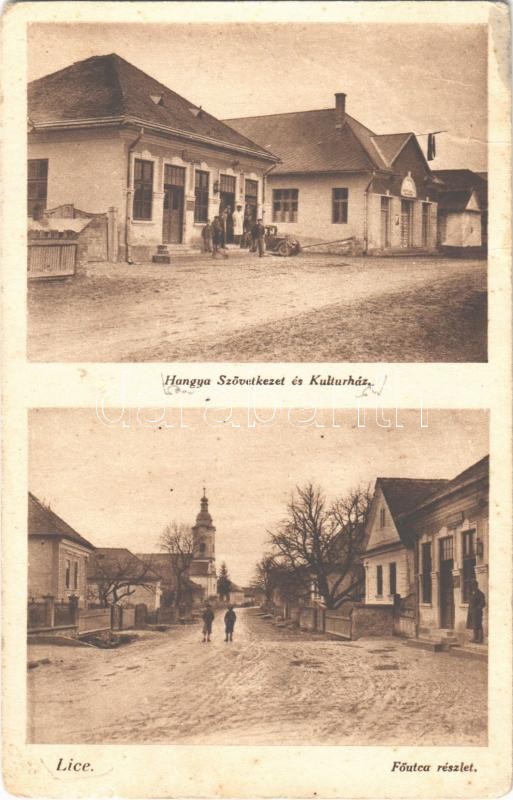 1940 Lice, Licince; Fő utca, templom, Hangya Szövetkezet üzlete és Kultúrház, automobil, magyar zászló / main street, church, cooperative shop, community center, Hungarian flag, automobile (r)