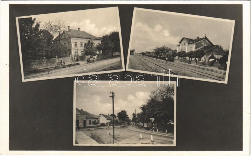 1942 Ipolyság, Sahy; M. kir. állami kórház, Vasútállomás, vonat, gőzmozdony, Újváros, automobil / hospital, railway station, train, locomotive, street view, automobile