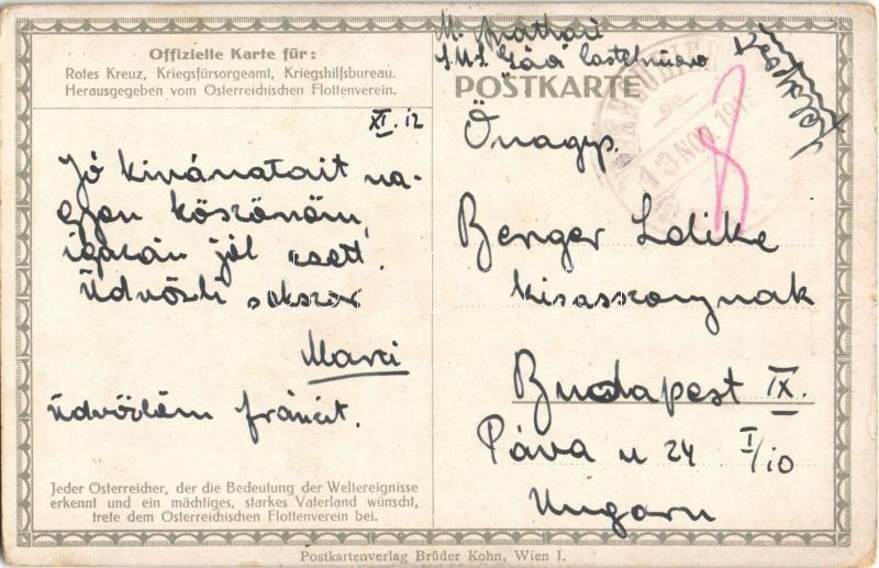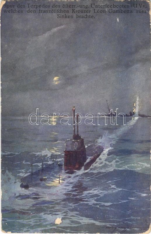 1915 Spur des Torpedos des österr.-ung. Unterseebootes U V (SM U-5), welches den französischen Kreuzer Léon Gambetta zum Sinken brachte. K.u.K. Kriegsmarine. Offizielle Postkarte des Österreichischen Flottenvereines zu Gunsten der Kriegsfürsorge. Brüder Kohn B.K.W.I. / WWI Austro-Hungarian Navy art postcard, U 5 submarine sank "Léon Gambetta" French armored cruiser s: Harry Heusser + "ZENSURIERT SMS GÄA" (kopott sarkak / worn corners)
