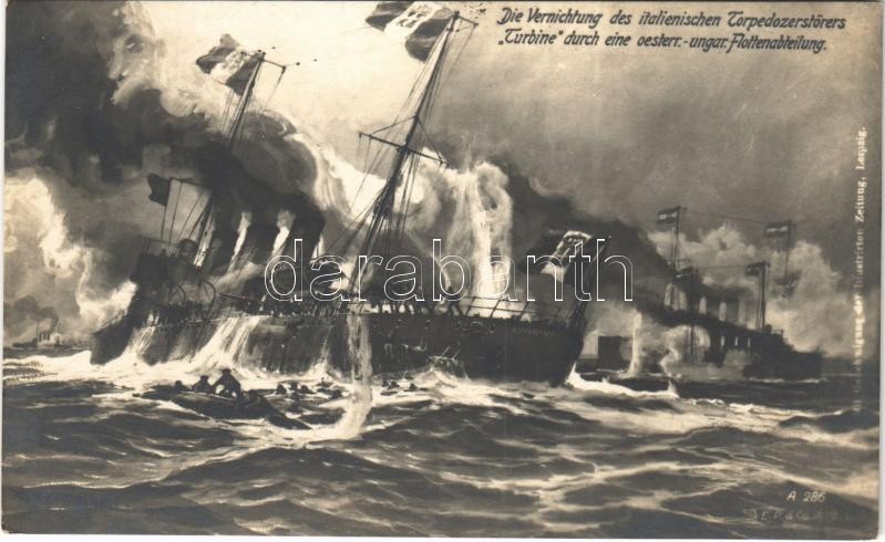 1917 Vernichtung des italienischen Torpedozerstörers "Turbine" durch eine österr.-ungar. Flottenabteilung / WWI Austro-Hungarian Navy art postcard, K.u.K. Kriegsmarine, battleships sink the Italian "Turbine" torpedo destroyer s: Alex Kircher