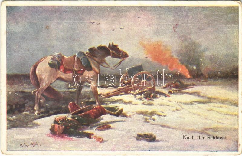 1915 Nach der Schlacht / WWI Austro-Hungarian K.u.K. military art postcard, after the battle, injured and dead soldiers. B.K.W.I. 259-70. (szakadás / tear)