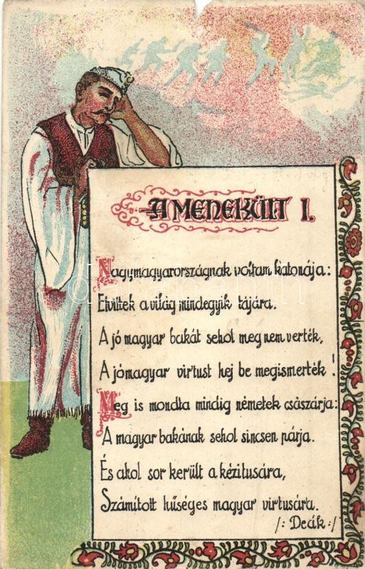 'A Menekült I.', egykori magyar katona, irredenta vers, kiad... https://www.darabanth.com/hu/401-Gyorsarveres/401.0/Kepeslapok/Katonai~1500082/A-Menekult-I-egykori-magyar-katona-irredenta-vers-kiadja-Deak-J-former-Hungarian-soldier-~II1532741