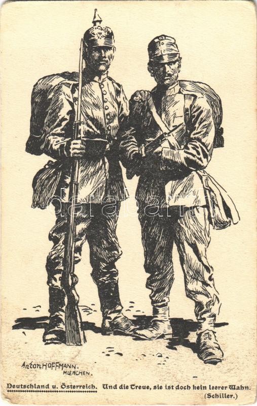 Deutschland u. Österreich. Und die Treue, sie ist doch kein leerer Wahn / WWI German and Austro-Hungarian K.u.K. military art postcard, Viribus Unitis propaganda s: Anton Hoffmann (kopott sarkak / worn corners)