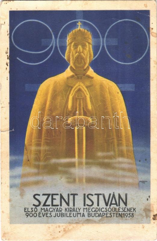 1938 Budapest XXXIV. Nemzetközi Eucharisztikus Kongresszus. Készüljünk a Magyar Kettős Szentévre! Szent István első magyar király megdicsőülésének 900 éves jubileuma / 34th International Eucharistic Congress s: Hollósi Endre (szakadás / tear)
