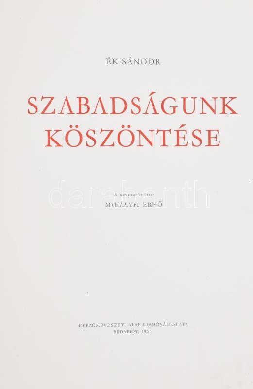 Ék Sándor: Szabadságunk köszöntése. Bp., 1955, Képzőművészeti Alap. Fé... https://www.darabanth.com/hu/401-Gyorsarveres/401.0/Konyvek/Konyvek-Epiteszet-muveszet~1000007/Ek-Sandor-Szabadsagunk-koszontese-Bp-1955-Kepzomuveszeti-Alap-Felvaszon-kotesben~II2363206