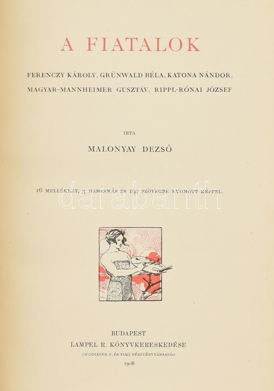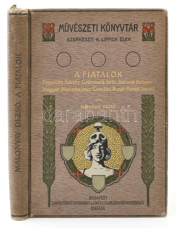 Malonyay Dezső: A fiatalok. Ferenczy Károly, Grünwald Béla, Katona Nándor, Magyar-Mannheimer Gusztáv, Rippl-Rónai József. Művészeti könyvtár. Bp.,1906, Lampel R. (Wodianer F. és Fiai.), 224 p.+16 t.+ 3 hasonmás. Szövegközti és egészoldalas képekkel gazdagon illusztrált. Kiadói szecessziós aranyozott, illusztrált félvászon-kötés, apró kopásnyomokkal a borítón és gerincen, kissé foxing foltos előzéklappal, de alapvetően jó állapotban.
