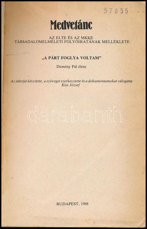 Demény Pál: A párt foglya voltam. Demény Pál élete. Az interjút készítette, a szöveget szerkesztette és a dokumentumokat válogatta Kiss József. Bp., 1988. Volt könyvtári példány. Kiadói papírkötés, kissé kopottas állapotban.