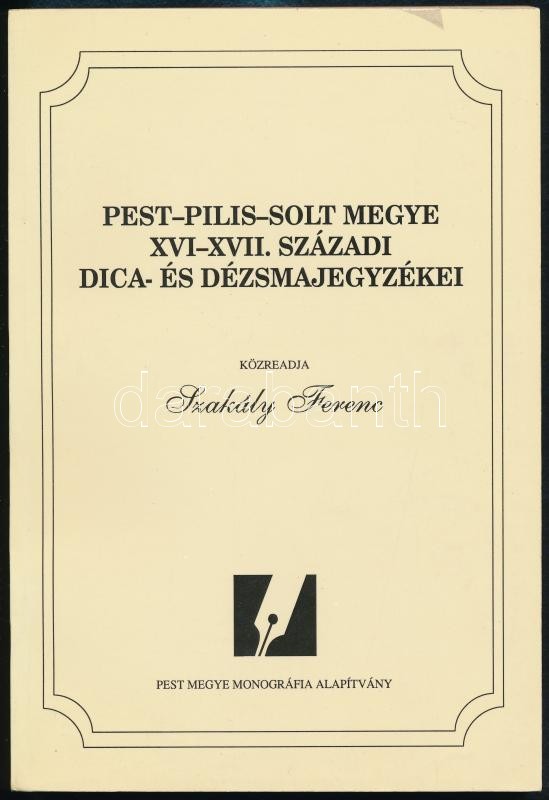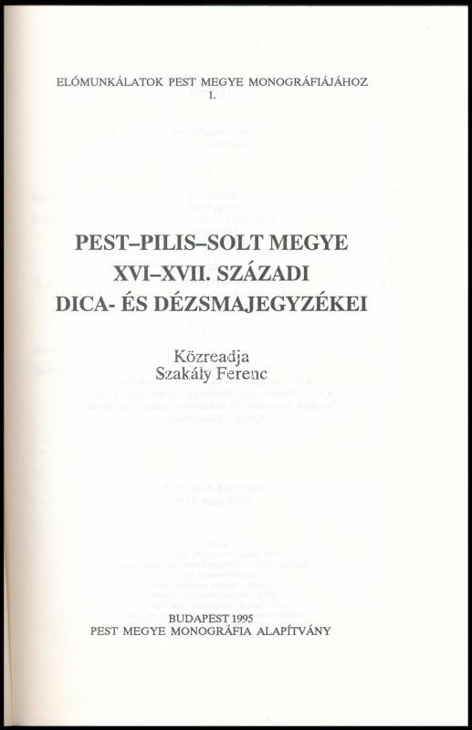 Pest-Pilis Solt Megye XVI-XVII. századi dica- és dézsmajegyzékei. Közreadja Szakály Ferenc. Előmunkálatok Pest Megye Monográfiájához. I. kötet. Bp.,1995, Pest Megye Monográfia Alapítvány. Kiadói papírkötés. Megjelent 1500 példányban.