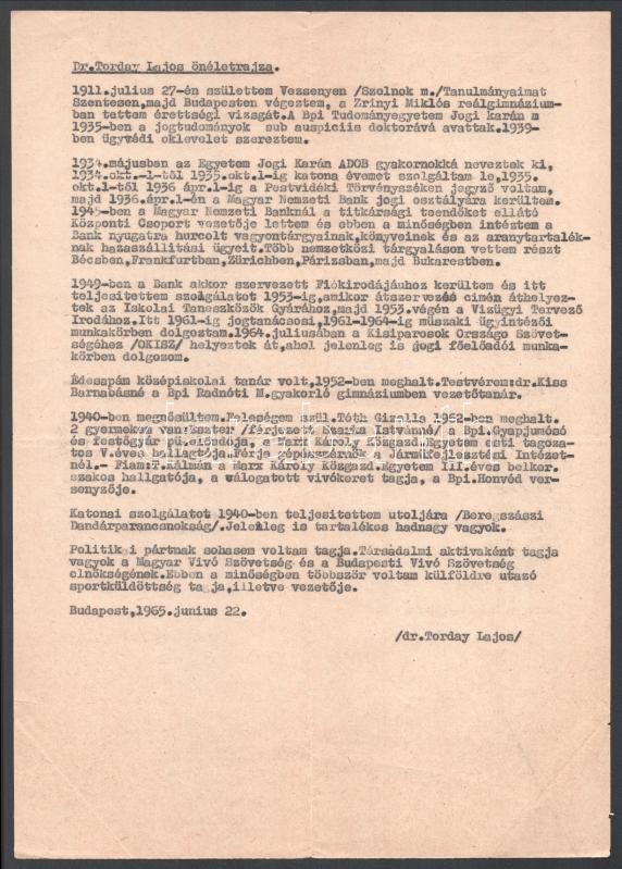 Leírás: 1940-1989 Dr. Torday Lajos a Magyar Nemzeti Bank ügyészének önéletrajza, gyászjelentés, levél a zsidótörvény kapcsán