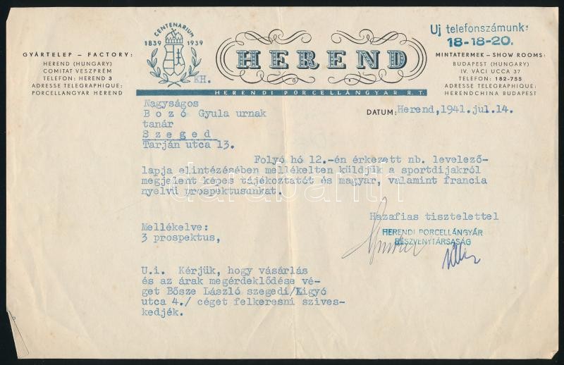 Leírás: 1941 Herend, Herendi Porcelángyár Rt. Bozó Gyulának címzett levele