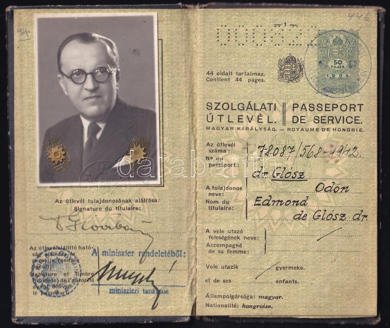 1942 Magyar Királyság által kiállított, fényképes szolgálati útlevél d... https://www.darabanth.com/hu/401-Gyorsarveres/401.0/Magyar-filatelia-es-postatortenet/Okmanyok~500017/1942-Magyar-Kiralysag-altal-kiallitott-fenykepes-szolgalati-utlevel-dr-Glosz-Odon-re~II2460467