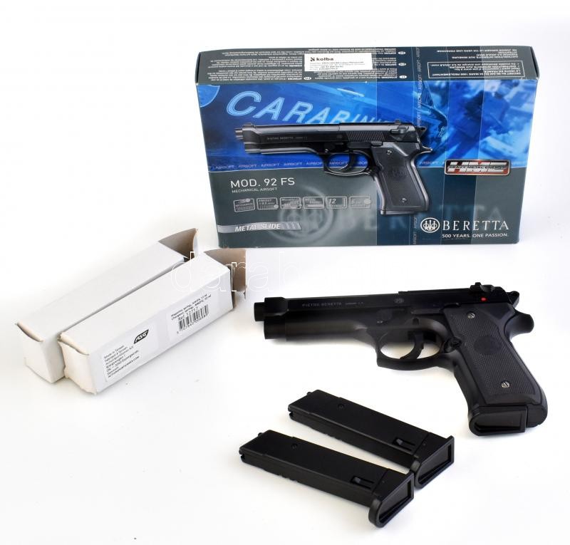 Beretta Mod. 92 FS rugós airsoft pisztoly, eredeti dobozában, leírással, újszerű állapotban + 2 db hozzá való ASG M92FS rugós tár + 6 mm 0,12 g BB lövedék, 1000 db
