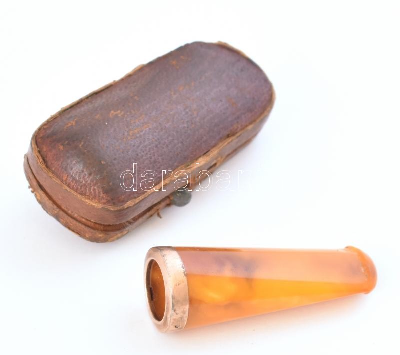 Leírás: Borostyán szipka, jelzett gyűrűvel, kopott sérült tokjában. h:4,5cm