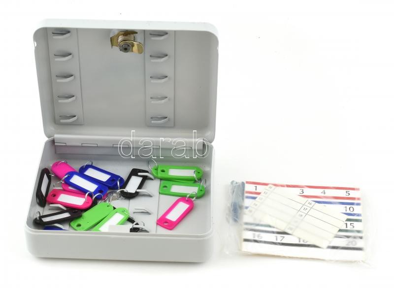 Leírás: Fém zárható kulcsszekrény, bilétákkal. 18x21 cm