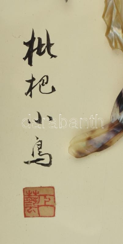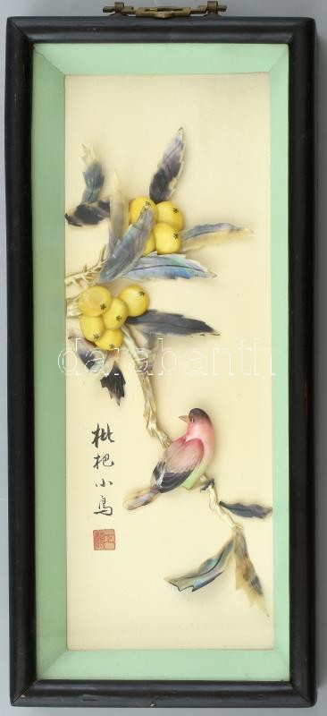 Leírás: Japán gyöngyházberakásos fali kép, üvegezett keretben, 31×13 cm
