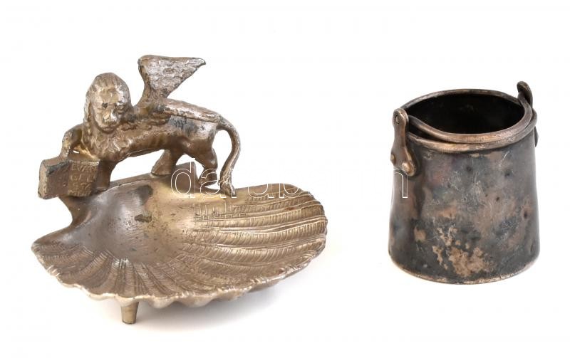 Leírás: Oroszlános kagylós tálka, fém, m:6cm, mini ón vödör, jelzett, m:5cm. Sérült.