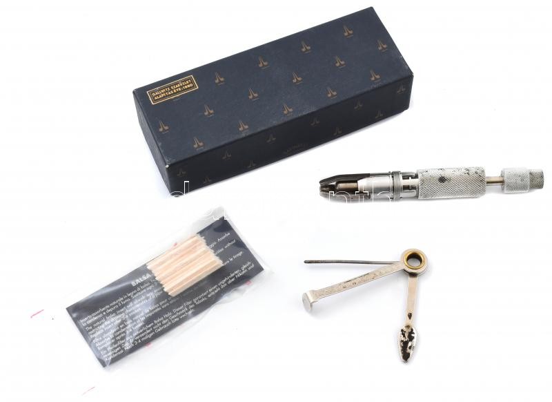 Leírás: Régi Savinelli balsafa pipaszűrő, fém applikátorral és pipatömővel (foltosak, h: 14 cm és 8 cm), eredeti papírdobozban