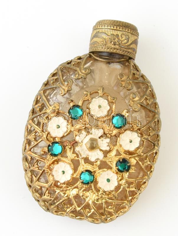 Leírás: Régi réz hálós parfümös üvegcse fém kupakkal, florális díszítéssel, kopott, m: 5,5 cm