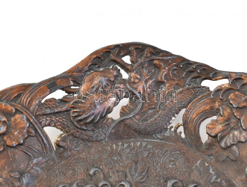 Leírás: Sárkányos fém tálka, kopott, d:16cm