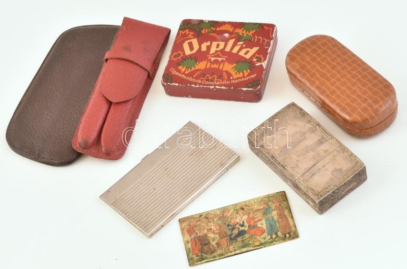 Leírás: Vegyes bolhatétel, névjegykártyatartó, szemüveg tokjában, perzsa fém doboz csont berakással, stb.