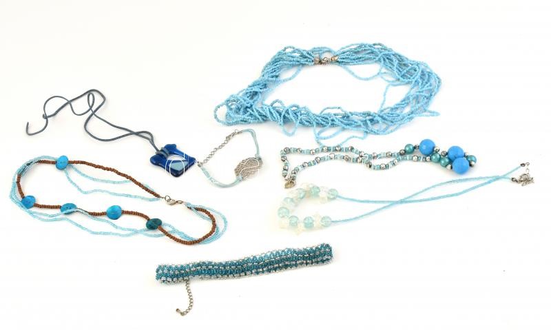 Leírás: Vegyes türkizkék bizsu szettek 6 db nyaklánc, choker, verlauf + 1 karlánc