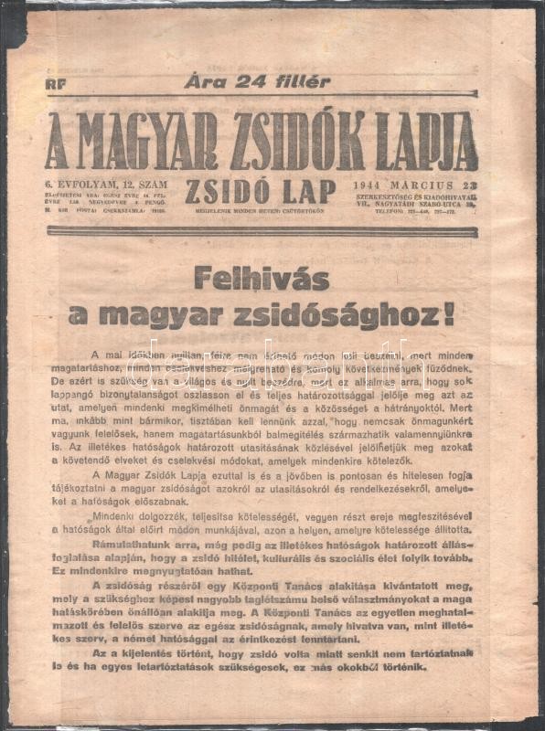 1944 A Magyar Zsidók Lapja 6. évfolyamának 12. száma, címlapon felhívá... https://www.darabanth.com/hu/401-Gyorsarveres/401.0/Mutargy-papirregiseg-egyeb/Judaika~500024/1944-A-Magyar-Zsidok-Lapja-6-evfolyamanak-12-szama-cimlapon-felhivassal~II2461976