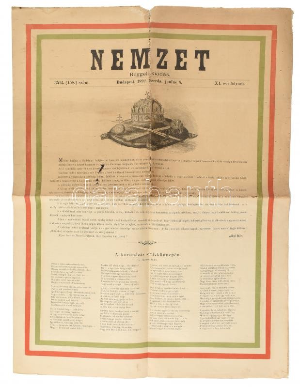 1892 A Nemzet c. újság június 8. száma a Ferencz József látogatásáról.... https://www.darabanth.com/hu/401-Gyorsarveres/401.0/Mutargy-papirregiseg-egyeb/Nyomtatvanyok~500030/1892-A-Nemzet-c-ujsag-junius-8-szama-a-Ferencz-Jozsef-latogatasarol-Hajtva-serult~II2466902