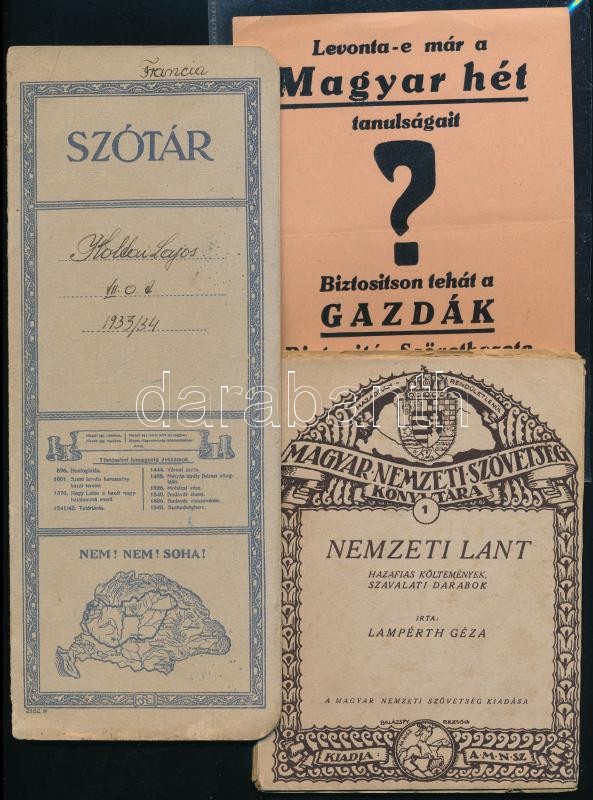 cca 1925 3 db régi nyomtatvány (szótárfüzet, Nemzeti Lant), irredenta ... https://www.darabanth.com/hu/401-Gyorsarveres/401.0/Mutargy-papirregiseg-egyeb/Nyomtatvanyok~500030/cca-1925-3-db-regi-nyomtatvany-szotarfuzet-Nemzeti-Lant-irredenta-jelmondatokkal~II2460629