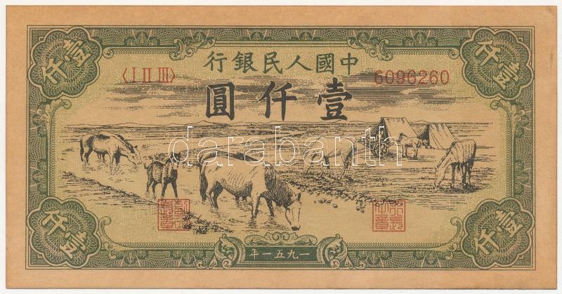 China 1951. 1000 ... https://www.darabanth.com/hu/401-Gyorsarveres/401.0/Numizmatika/Kulfoldi-bankjegyek~2000013/Kina-1951-1000Y-TII-hajtatlan-sarokhajlasok-fo-China-1951-1000-Yuan-CXF-unfolded-folded-c~II2462510