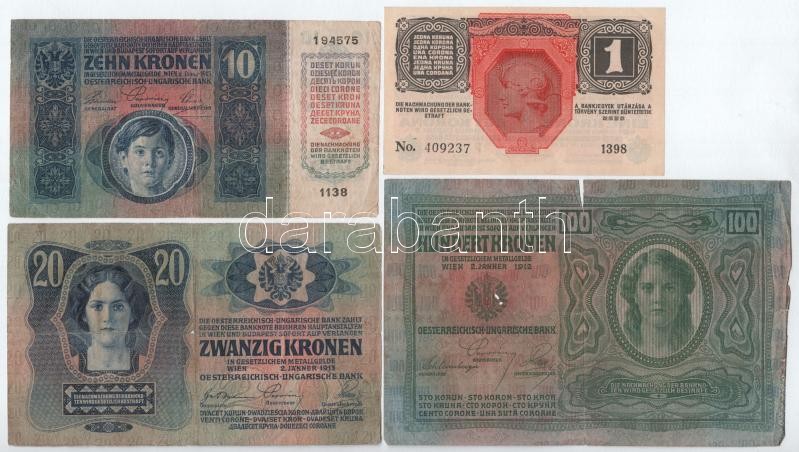 Leírás: 1912. 100K + 1913. 20K + 1915. 10K + 1916. 1K T:II--III-