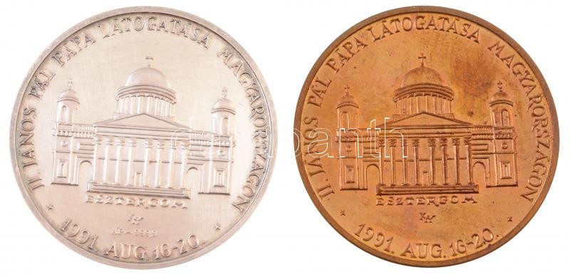 Kiss György (1943-2016) 1991. "II. János Pál pápa látogatása Magyarországon - Esztergom / Budapest, Pécs, Szombathely, Esztergom, Debrecen, Máriapócs" Br emlékérem ás Ag emlékérem dÃsztokban (31,18g/0.999/42,5mm) T:1-,1- (PP) felületi karc
