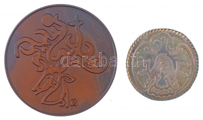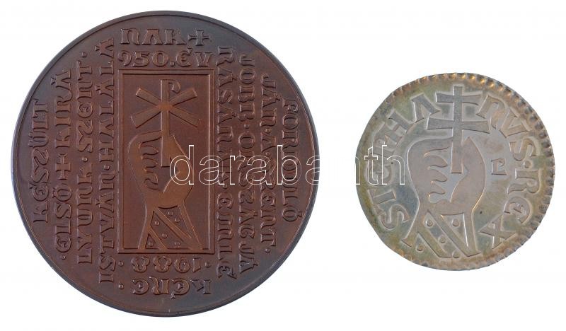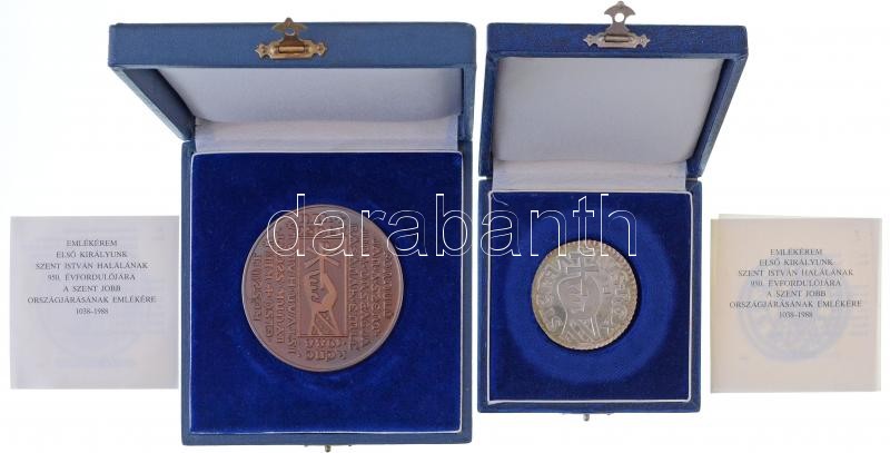 Papp László (1947-) 1988. "Első királyunk Szent István halálának 950. évfordulóján a Szent Jobb országjárásának emlékére - Turul" patinázott Ag emlékérem dísztokban, sorszámozott tanúsítvánnyal (28,84g/0.935/47mm) + 1988. "Első királyunk Szent István halálának 950. évfordulóján a Szent Jobb országjárásának emlékére" patinázott vörösréz emlékérem dísztokban, sorszámozott tanúsítvánnyal (70mm) T:1,1-