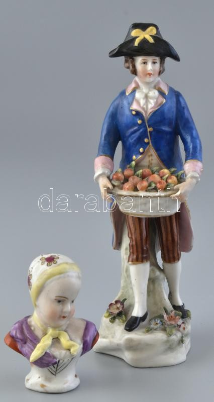 Leírás: 2 db antik figura, kézzel festett porcelán, egyik jelzett, kopott, sérült, restaurált, m: 6 és 17 cm.