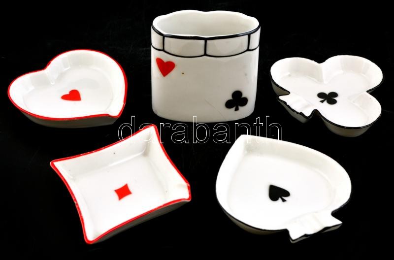 Drasche porcelán cigaretta kínáló m:6,5 cm és egy személyes hamuzós 8 cm szett francia kártya dekorral / Cards motive. Kézzel festett, jelzett, kis kopásokkal.